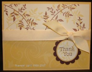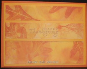 The second stamping project was the new technique I learned at the Philadelphia Regional Stampin' Up!® Seminar. The technique used to create this background is Vitalized Vellum. To do this cool technique you need three coordinating Craft Stampin' Pads® and Vellum Card Stock. Start with the lighest color and rub all over your Vellum Card Stock. Repeat with the second darkest color, leaving some of the first color showing. Repeat second step. Stamp as desired. Solid stamps work best, such as Autumn Fest in the card below.