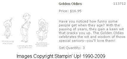 I don't know what my girlfriend was thinking when she gave me this card for my birthday – I'm only 29.95 plus shipping and tax. :) Anyway, this adorable stamp set designed for folks much older than myself (doth she protest too much?) is in the Occasions 2009 Mini Catalog and DID NOT make it into the 2009-2010 Stampin' Up! Idea Book & Catalog. So, truly you last chance to order this stamp set is June 30, 2009.