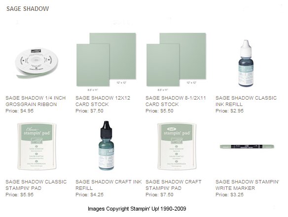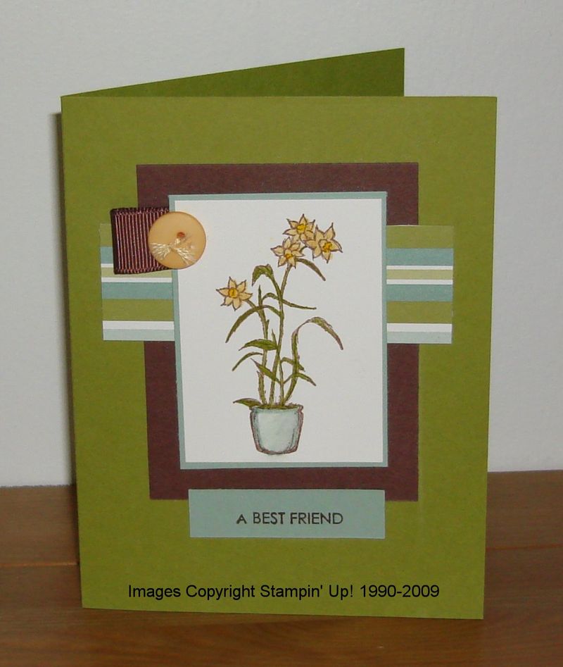 The colors are Old Olive, Chocolate Chip, So Saffron, Sage Shadow and Whisper White. By golly, I don't think I would have ever put Old Olive and Sage Shadow together, but this card is beautiful.