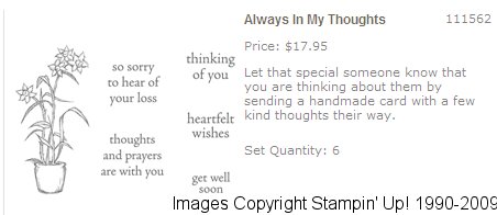 Always in My Thoughts is available for purchase only through June 30, 2009. Follow the link www.stampinsmiles.stampinup.net to place your online order now!