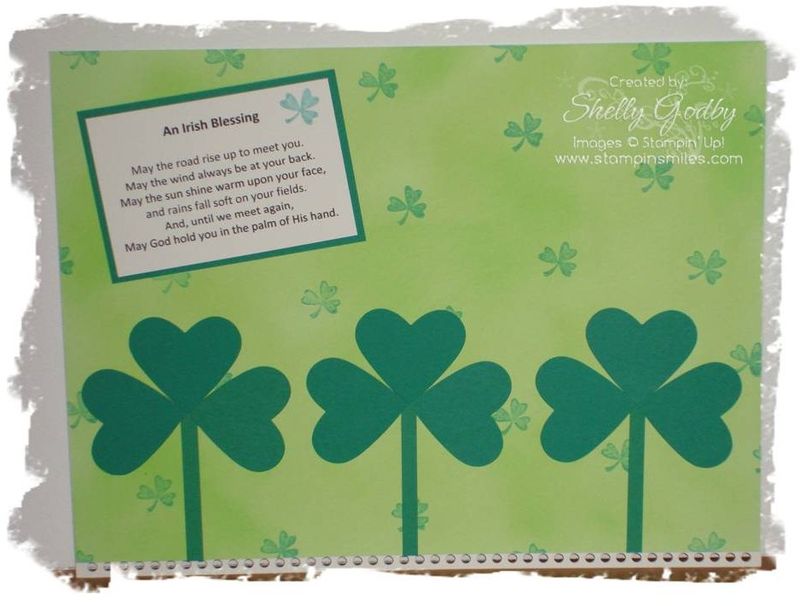 Because I did not want to wait for the Craft Ink to dry, I stamped the little shamrocks from Holiday Blitz stamp set in Craft Ink too – Glorious Green. I also wondered if the Classic Ink would stamp well on the pigment (Craft Ink). I was pleased with the results and so did not try. Let me know if you try it and what results you get.