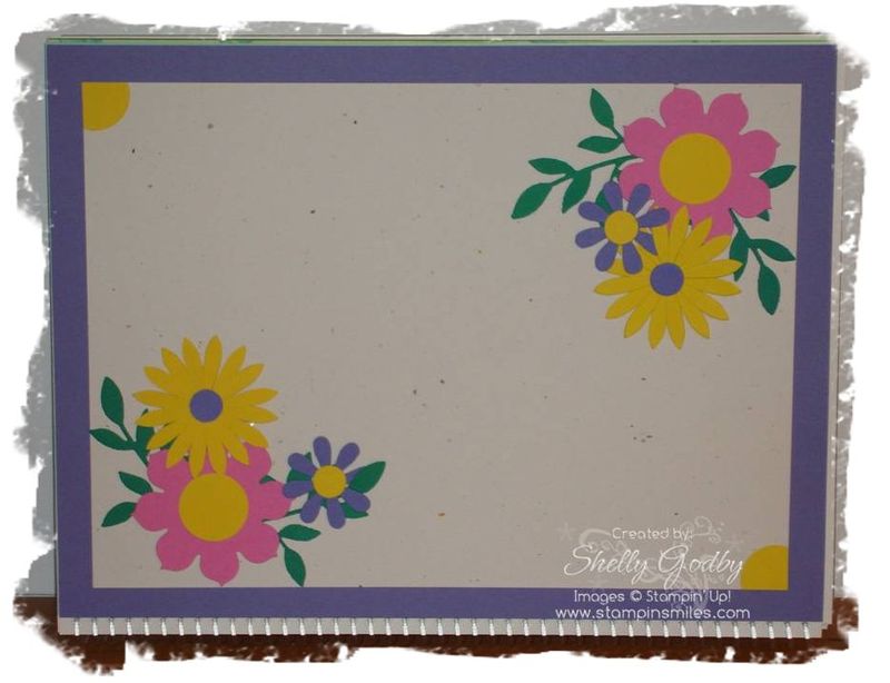 My flower colors are Pixie Pink, Yoyo Yellow, and Lovely Lilac. My leaves are Glorious Green die-cuts from the Stampin' Up! exclusive Little Leaves Sizzlit.