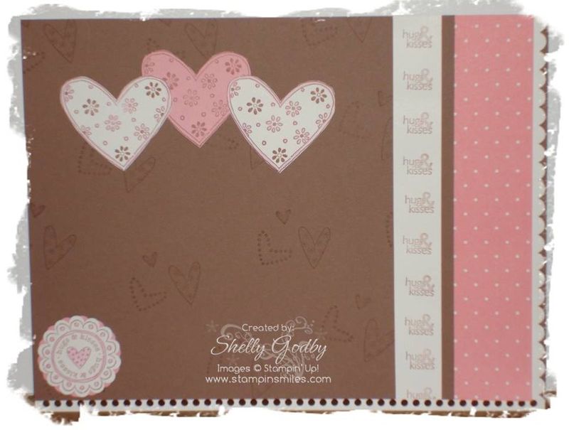 My February page was fun and easy with just two ink colors: Basic Brown and Pretty in Pink. My chosen stamp set is Love You Much with All Holidays for the Hugs & Kisses stamp.