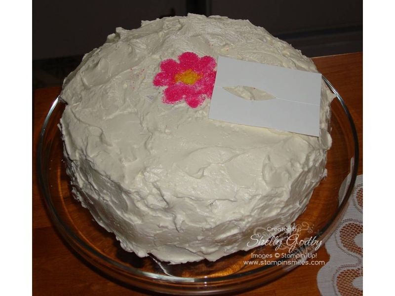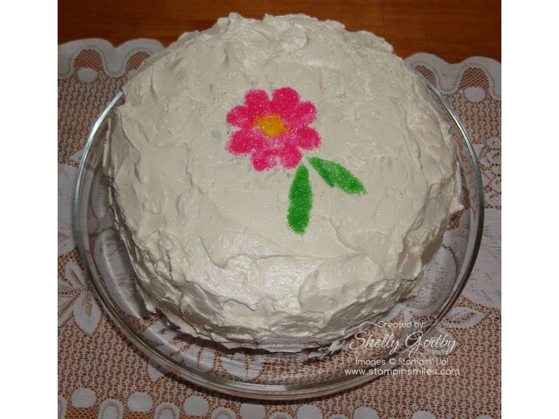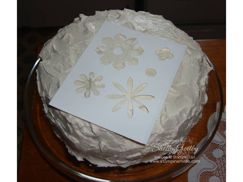 Yum! White cake with buttercream frosting! But, instead of the usual birthday candles, the idea to popped into my head to try my Big Shot and Stampin' Up! Blossom Party Original Sizzix Die to make a flower stencil. I was excited to see if it would work. I remembered to grab my camera so you, too, could see how I did if it worked.