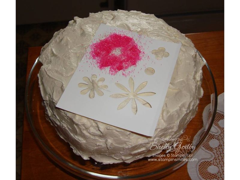 Here is my sugar-filled stencil. I gently pushed the sugar into the frosting before removing my flower stencil. There was some frosting sticking to the back of the Whisper White card stock. It was a dirty job, but someone had to lick the frosting off the stencil.