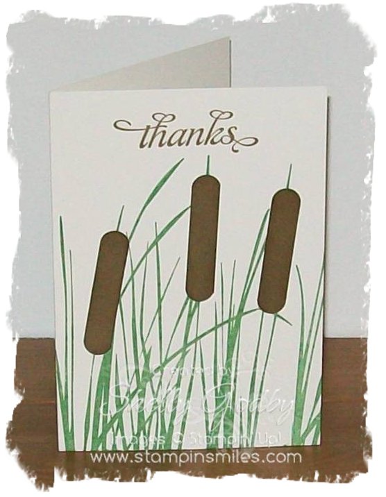 The green of my cattails is from the Inspired by Nature stamp set stamped with Garden Green Classic Ink. The brown, fuzzy part of the cattail was created with the Word Window Punch, Soft Suede Card Stock sponged with Soft Suede Classic Ink.