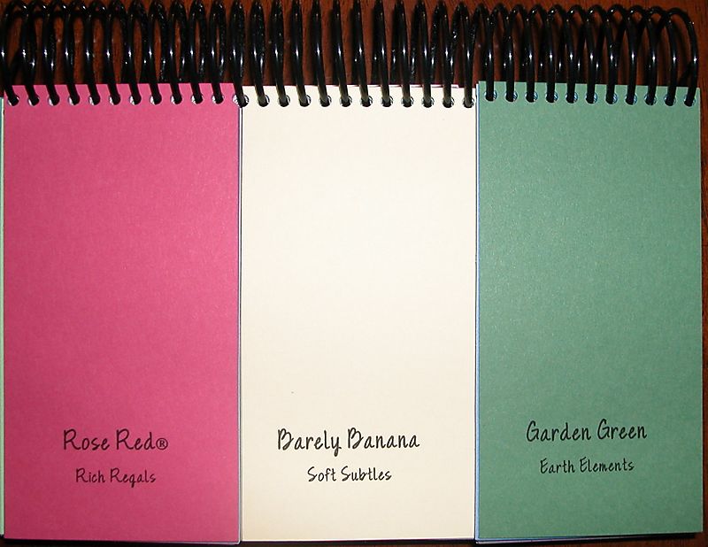 The card stock colors are in the same order as you will find them displayed in the Stampin’ Up! 2009-2010 Idea Book & Catalog. This feature allows you to quickly find your choice of colors. The color name and family is printed on each piece! No guessing games of the color you are looking at.