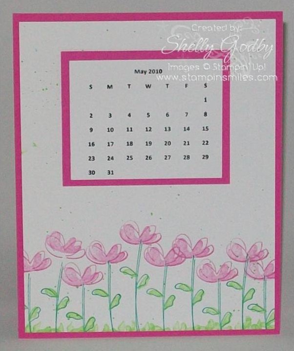 My bright and cheery May CD calendar was hand-stamped with the Awash with Flowers stamp set. It was two-stepping fun and fast. I used the same color ink, Pink Passion, for the outline and fill flower images.
