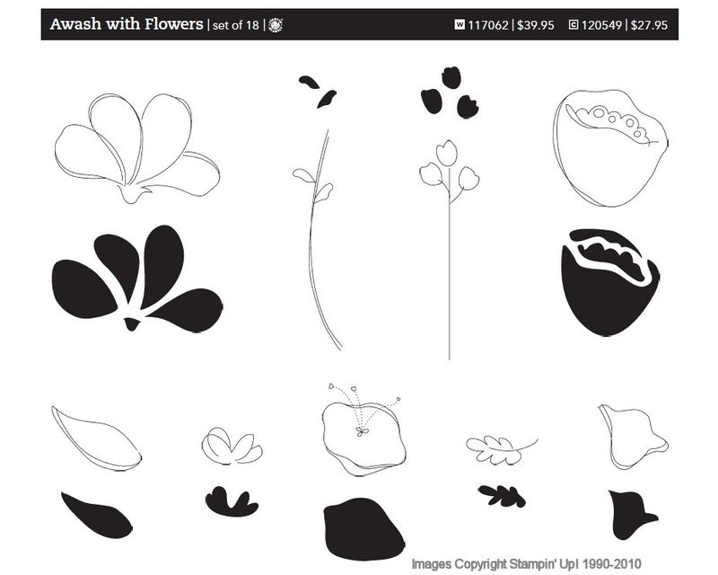 The 2010-2011 Stampin' Up! Idea Book & Catalog sneak peek stamp set Awash with Flowers (images pictured below) is a very fun, versatile two-step flower stamp set. Loaded with flowers and possibilities!