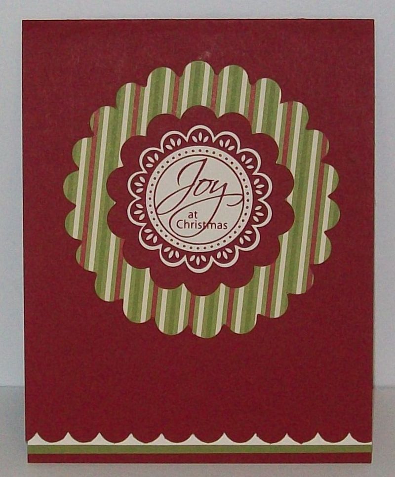 One stamper said she thought this card looked so pretty and complicated until she sat down to make it. It really is quite simple. I just used several tools: Scallop Circle Punch, 2-3/8" Scallop Circle Punch and Sizzix Scallop Circles #2 Bigz Die, Scallop Edge Punch, the pretty new Jolly Holiday Designer Series Paper and the pretty color combination of Cherry Cobbler, Old Olive and Very Vanilla.