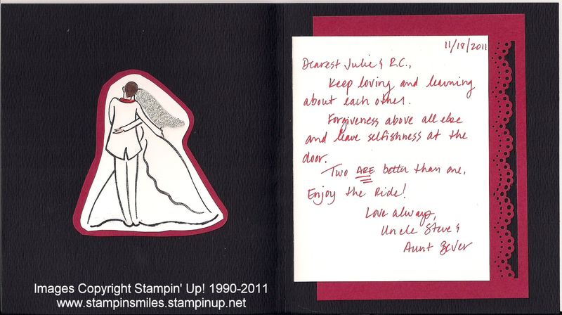 Beverly's card is as pretty on the inside as the out! Not only did she add the stamped bride and groom, her handwritten note is embellished with a coordinating and decorated piece of card stock. All I can say is "Wow!"