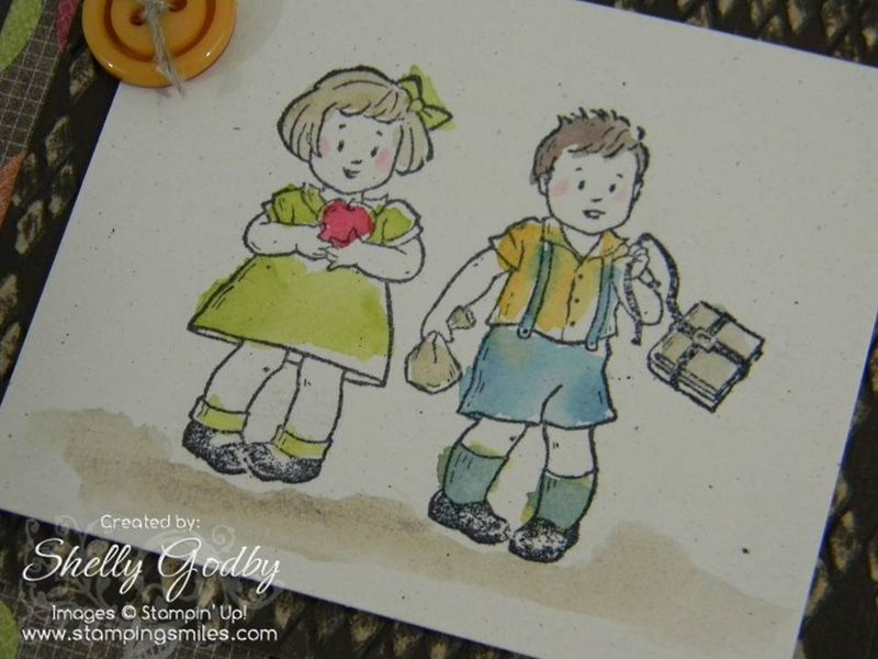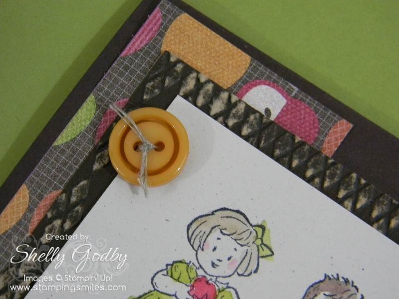 Adding some color coordinated embellishments was fun. Did you notice the distressed card stock matting behind the children? It is the new Early Espresso Core'dinations Card Stock. When distressed, you get to see the color under the surface. This is very different for Stampin' Up! This is an exception to the regular line of card stock in which the color goes through every layer.