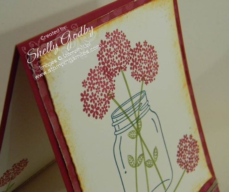 The Stampin' Up! Perfectly Preserved stamp set is from the 2012 Stampin' Up! Holiday Catalog and only available for a limited time. The stamp set is full of country charm with a canning jar waiting to be filled with several different items. For this card, the canning jar is being used as a vase.