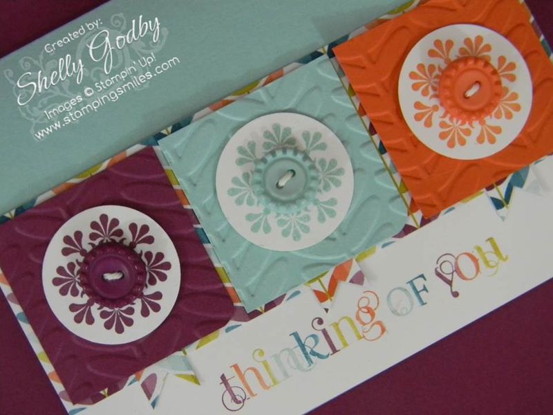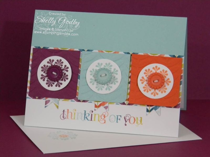 The flower/decorative stamp is from the free Madison Avenue stamp set (a free Sale-a-bration product!) and was stamped three times in the colors of Rich Razzleberry, Pool Party and Tangerine Tango. Then each stamped flower was given a button of the same color for the center. The buttons are all from the Sycamore Street Ribbon & Button Pack (free Sale-a-bration product!).