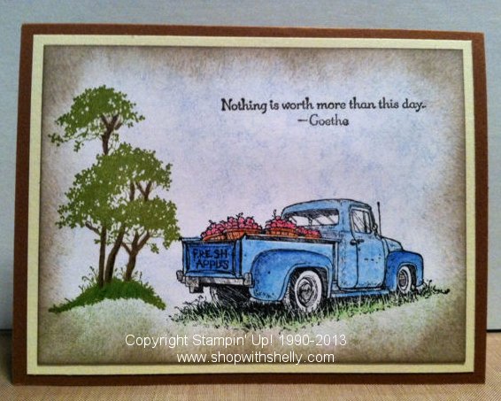 The pretty tree is from the Serene Silhouettes stamp set. The pick up truck is from the Countryside stamp set. The greeting "Nothing is worth more than this day." is from the 2012-2013 Stampin' Up! Catalog hostess only Summer Afternoon stamp set.