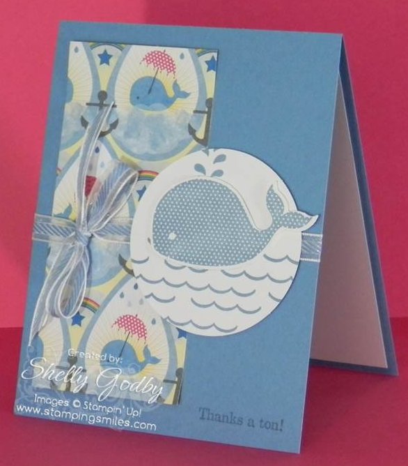 Oh, Whale is spouting off about how much he likes having more whale friends to play with on the whale pattern of the Sunshine & Sprinkles Designer Series Paper. What may not be immediately obvious is he was die-cut with the Happy Whale Clearlits Die. A lot easier than cutting them all out by hand. With the Clearlits Dies (as in this example using the same card template), you stamp, center the die around the image then die-cut. Pretty nifty. Sure is a lot easier than trying to stamp onto card stock that has already been die-cut.