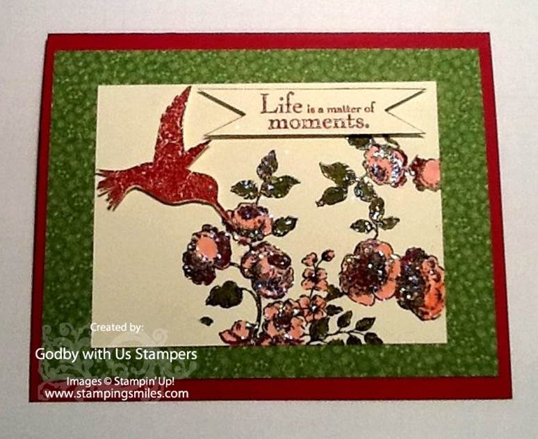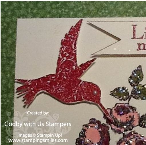 In this picture, not only do you get a close up of the beautiful hummingbird, you can see why we call Deanna our Glitter Queen. Even though there is a lot of glitter, it does not look over done. Guess when you are the Glitter Queen, you know how to wield glitter wisely. 🙂