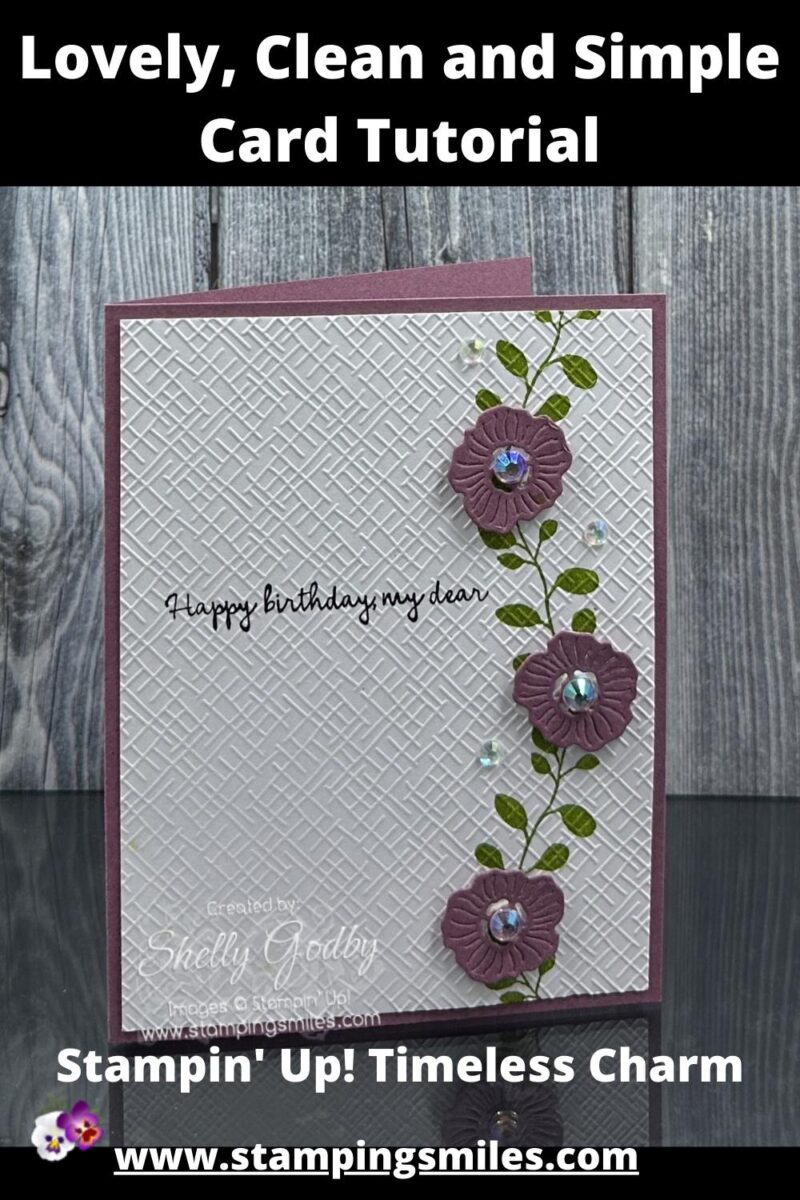 Did you know that on July 6, 2023, Stampin’ Up! is releasing new products? It’s always fun to get our hands on something new! I’m demonstrating a clean and simple card with the Stampin’ Up! Timeless Charm from that upcoming release.